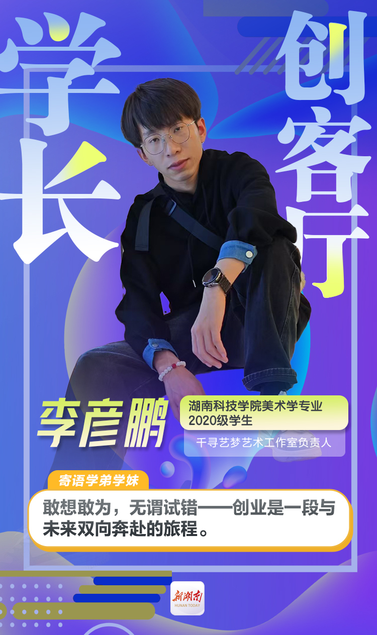 李彦鹏,湖南科技学院美术学专业2020级学生,千寻艺梦艺术工作室负责人,乡村美育践行者、非遗文创探索者、墙绘“破圈”青年。2022年,正式成立“千寻艺梦艺术工作室”,以墙绘为切口进军商业领域,累计完成5000平方米墙绘,服务甘肃省定西市新坪村、永州市零陵区永荷村等5个乡村、7所学校,并开发非遗文创产品,助力传统技艺焕新。如今,工作室年营收突破30万元,成为乡村振兴与艺术融合的标杆案例。