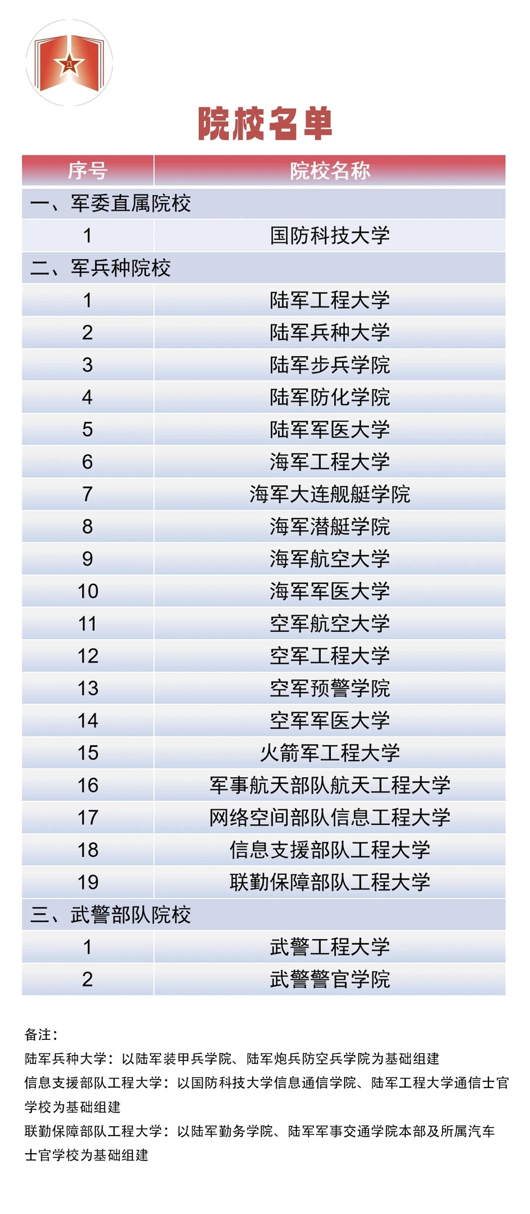 今年,共有22所军队高等教育院校面向普通高中毕业生招生。其中,军委直属院校1所,军兵种院校19所,武警部队院校2所。