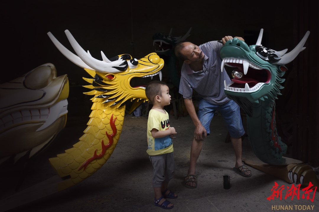 60多岁的陈兵寿,一生雕刻了500多个龙船头。“龙船头制作的选料很关键,形要好,质要硬,”谈起龙船头雕作,瘦瘦的陈兵寿精神奕奕。“只要看中了做龙船头的树,不管是不是自己村的,放一串鞭炮,就可以砍回来,绝无阻拦。这是道州千百年来的好习惯。”