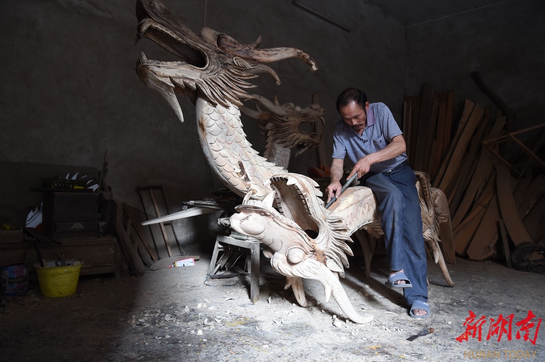 这是一间简易的工作室。从湘南古城道州东阳坊的红门楼拐进来,是一条窄窄的巷子。 国家非遗龙船头制作的传承人陈兵寿的工作室,就在巷子的一侧。屋檐下,堆满了雕制龙船头的香樟和旱柳。门口两个已雕好的龙头,一袭金衣,龙须飘飘,炯然有神。