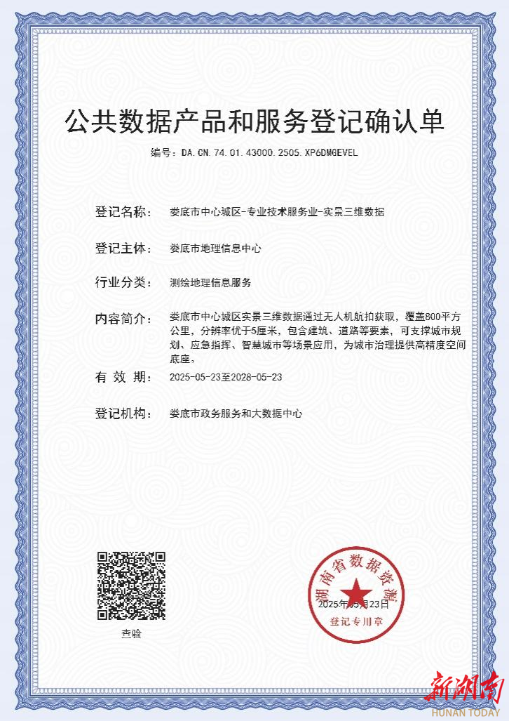 湖南日报·新湖南客户端5月28日讯(通讯员 张华 张望)近日,娄底市地理信息中心(娄底市卫星应用技术中心)成功获得娄底市中心城区实景三维数据、正射影像数据两份公共数据产品和服务登记确认单,标志着该中心在数据资源建设与管理能力上迈上新台阶,为全市自然资源管理、智慧城市建设及社会治理提供坚实的数据支撑。