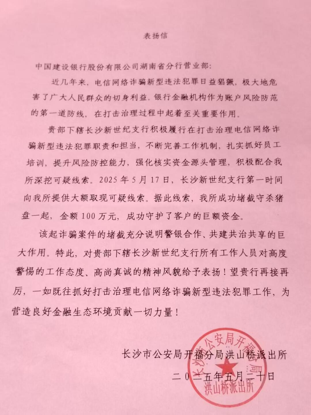 第二天上午,作为张富清金融服务队一员的建行新世纪支行主管侯游艺一上班,发现有客户预约取现100万的现金送到网点,瞬间回想起前一天在微信群中看到的消息,立即向开福区公安反诈人员告知取现线索,并上报营运主管,联系服务客户的副行长,辅助了解客户资金来源及用途,并进行反诈风险提示。客户表示知晓,一再强调资金使用绝对没问题。