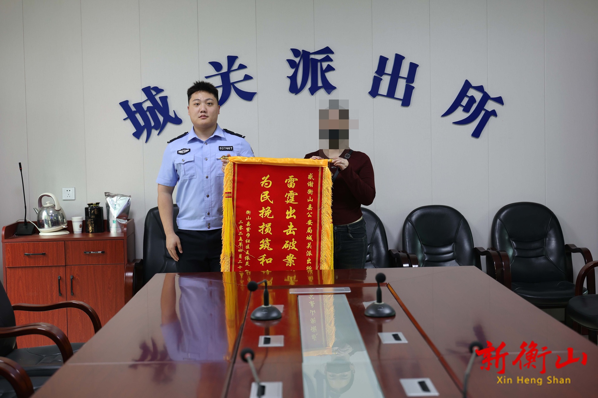 王女士向衡山县公安局城关派出所民警送上一面锦旗