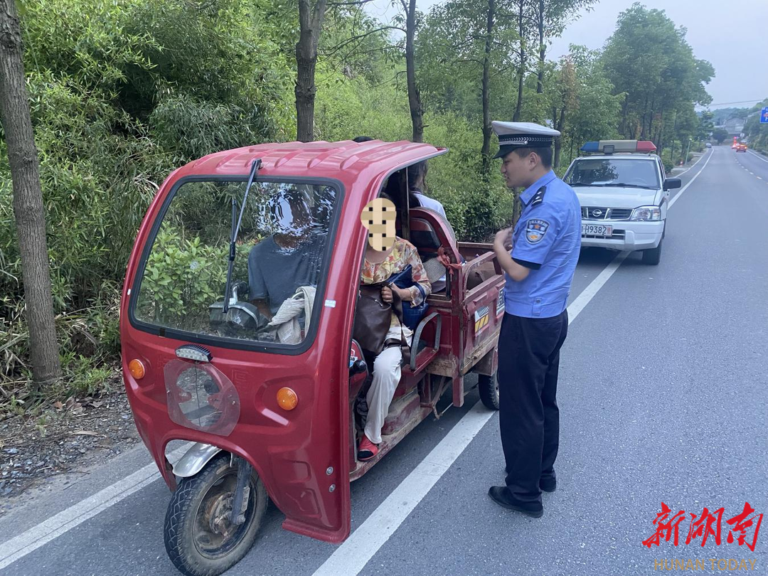 湖南日报·新湖南客户端6月3日讯(通讯员 胡卫红 秦滔)近日,一辆电动三轮车在国道536线桃江县大栗港镇路段摇摇晃晃前进,其驾驶座挤坐了两人,车斗里还搭载着两名学生。因车速不快,车后跟着的其他车辆接连超越,稍有不慎,可能会发生交通事故。正在该路段巡逻的桃江交警吴骏见状第一时间拦停该车。
