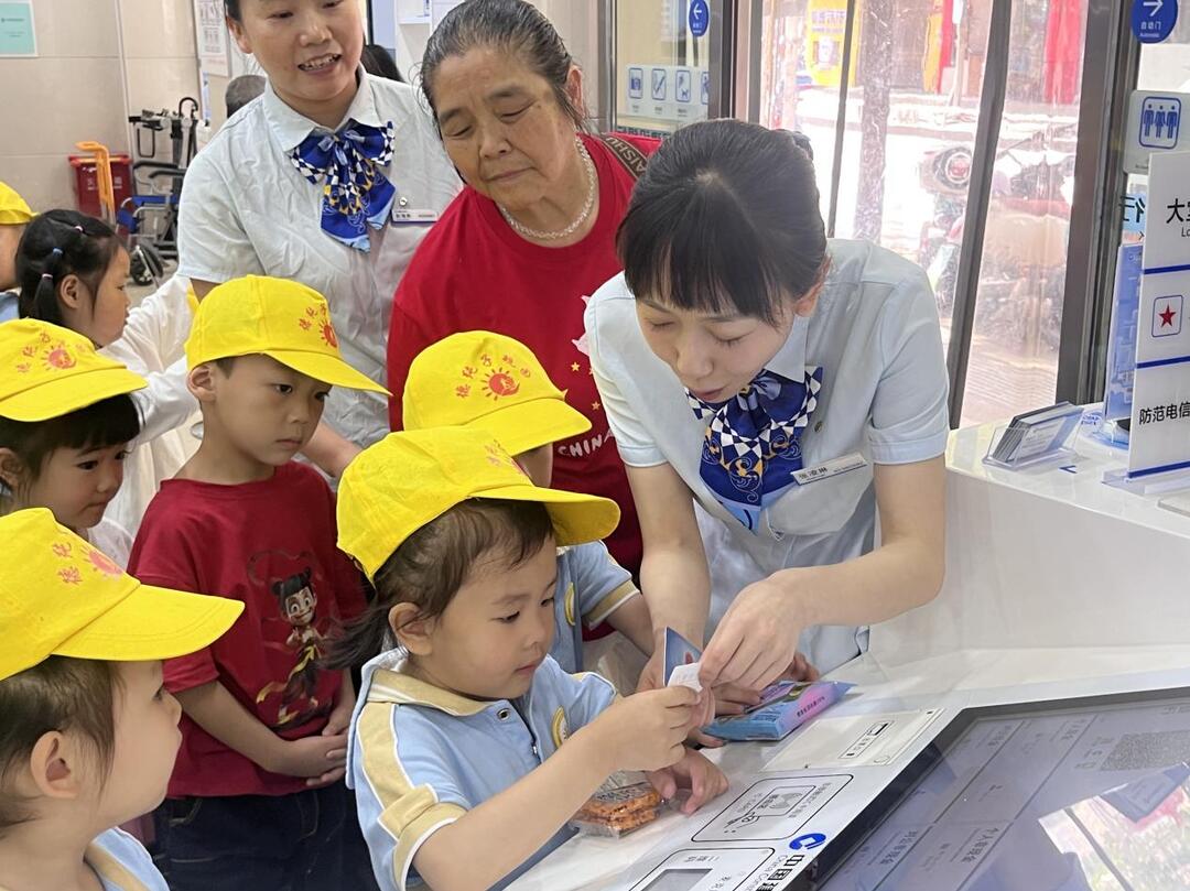 为了让孩子们更直观地感受银行工作,工作人员带领孩子们实地参观了银行营业网点。明亮整洁的大厅、忙碌有序的柜台、先进智能的设备,都让孩子们感到新奇不已。孩子们近距离观察银行工作人员办理业务的流程,了解了从客户取号、业务咨询到业务办理完成的整个过程,对银行工作有了更深刻的认识。