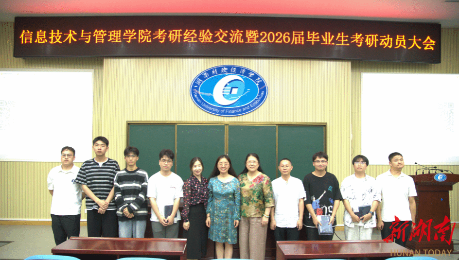 5月28日,湖南财政经济学院信息技术与管理学院举办考研经验交流暨2026届毕业生考研动员大会。学工办副主任陈慧主持会议,电子信息工程系主任彭慧、计算机科学与技术系卢泽斌老师分别作考研动员报告与专题讲座。院党委副书记唐雄伟,2021级毕业生代表,2022级、2023级班级辅导员及学生代表参会。
