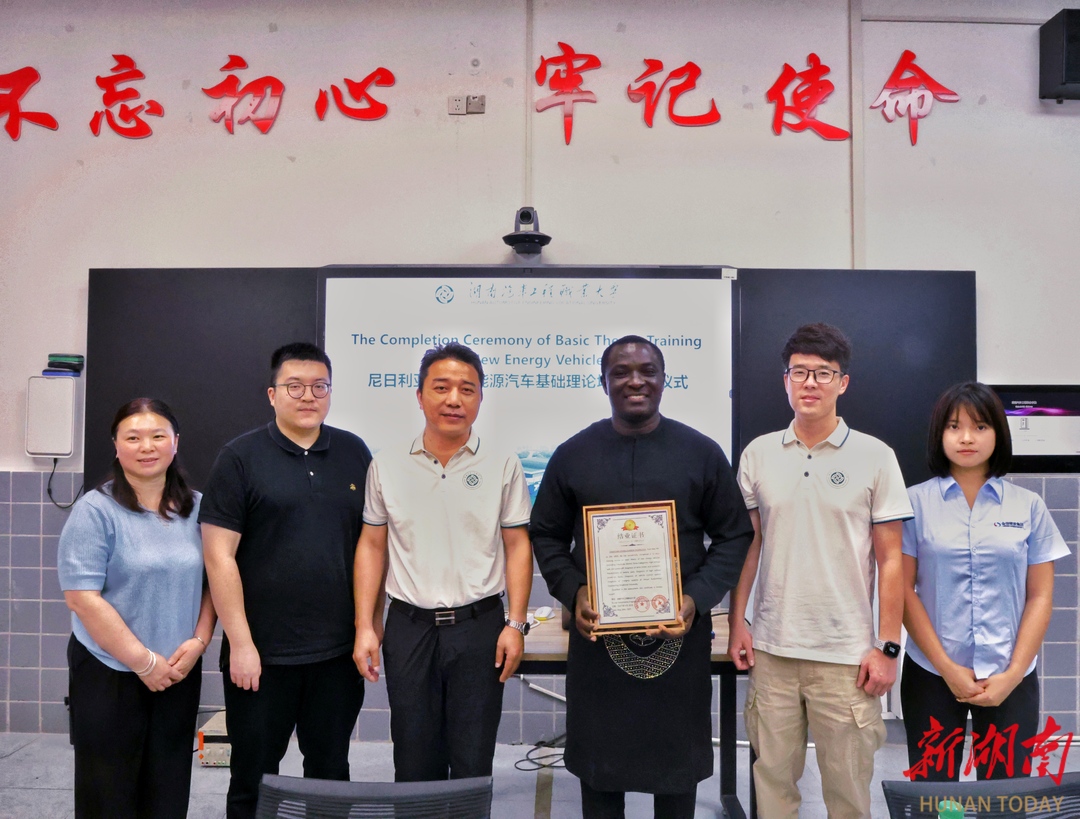 湖南日报6月6日讯(通讯员 杨佳思 周浩鸿 全媒体记者 杨斯涵)近日,一场特殊的结业仪式在湖南汽车工程职业大学北汽基地举行。作为本期培训的唯一学员,来自尼日利亚MerryHeight Energy Systems Nigeria公司的创始人、总经理Jonathan Ogiemudia,接过该校车辆运用学院副院长李霞辉颁发的结业证书。这场一个人的结业典礼,也成为湖南汽车工程职业大学国际化技术培训的生动注脚。