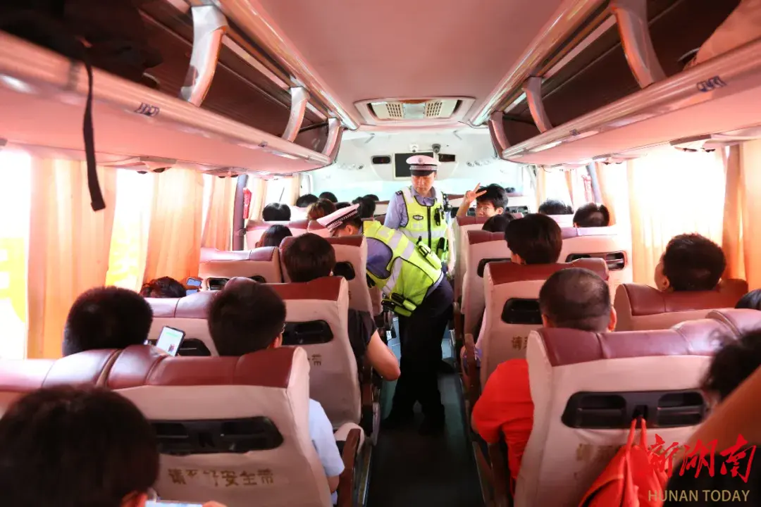 衡阳高速交警在送考出发前检查考生乘车情况。