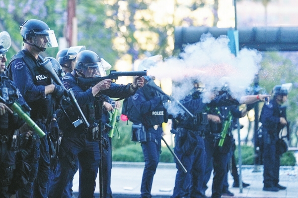 6月8日,在美国加利福尼亚州洛杉矶的联邦拘留中心附近,警察试图驱散抗议人群。