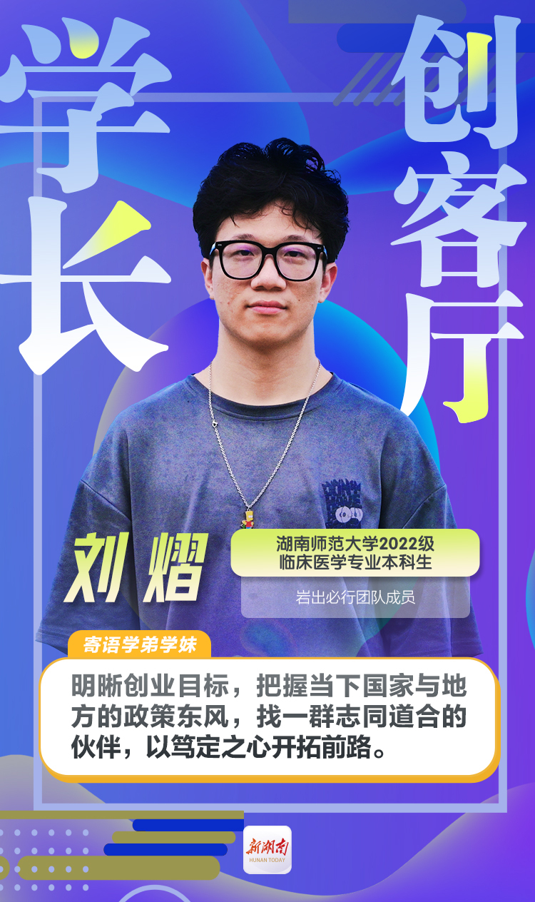 2022年9月,湖南师范大学新生踏入了大学校园,在第一学期他偶然了解到医学院在他的家乡桂东县有一个创业的项目,团队发起人黄智学长正是他的老乡,与此同时,团队的指导老师陶晓军挂职了桂东县科技副县长,桂东县成为连接刘熠与岩出必行团队的重要桥梁。出于对创业的好奇,刘熠报名加入了这个团队,成为岩出必行团队的一份子。在2022年,刘熠跟着团队中的老师和学长学姐不断学习,参与到药物的研发生产阶段,最终研发出治疗脑梗塞后遗症的通脑复神颗粒和治疗坐骨神经痛的中药贴剂两项产品。到了2023年,刘熠开始担当项目的负责人,他也逐渐明白创业的使命与重重困难。