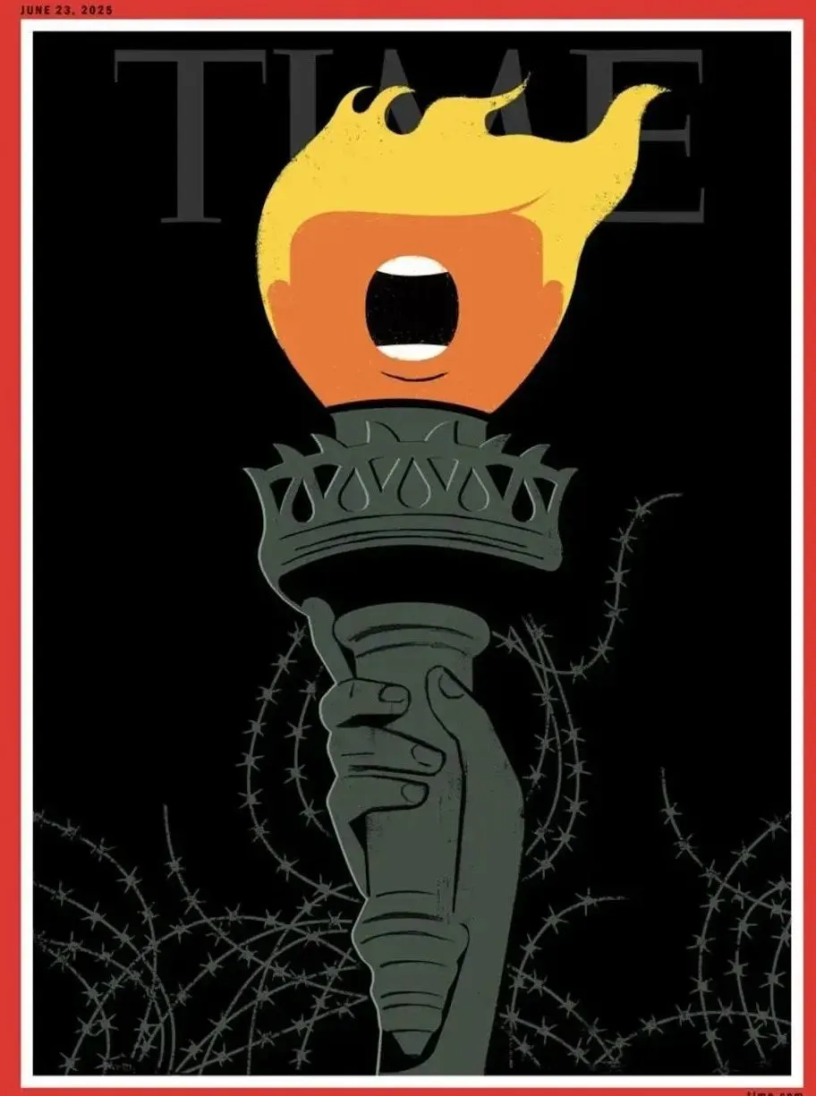 《时代》杂志最新一期封面,入目即是自由女神高举的火炬,只是上面跳动的是如同火焰的特朗普面部轮廓,底色则是错综复杂的铁丝网,讽刺意味呼之欲出。
