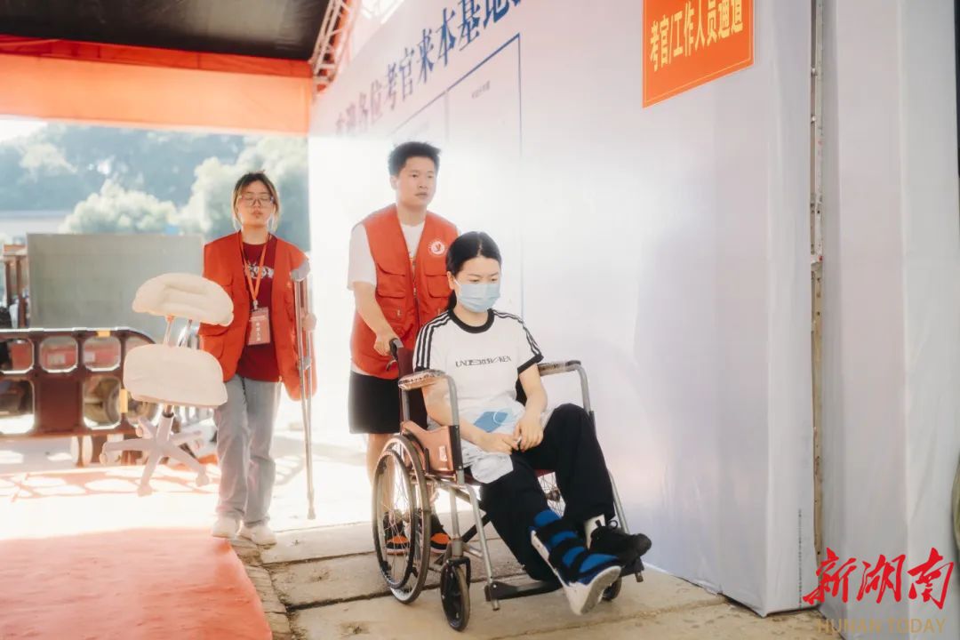 “考生请在此排队等候,提前准备好需查验的各项资料……”14日上午7时,第一场考生陆续来到考场入口处。考务人员指引考生有序排队等候,并逐个进行身份识别、安检等。“考生你好,我们基地为你准备了轮椅,并将由我全程陪考。”考务组得知考生小婕拄拐,安排志愿者提前在考场入口等候,陪同小婕由绿色通道进入考场。