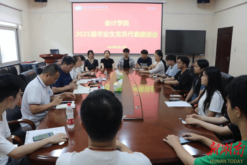 6月12日下午,湖南财政经济学院会计学院召开2025届毕业生党员代表座谈会。院党委书记戴恩湘,党委副书记肖芳,学工办主任蔡益华与毕业生党员代表深入交流,倾听意见建议,送上真挚祝福。
