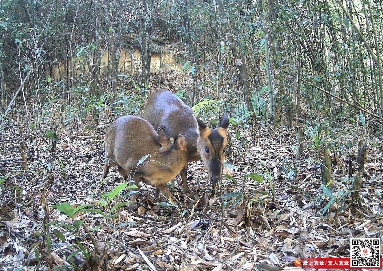 红外相机还记录到了小麂一家温馨同框的场景,画面中,两只小麂紧紧地依偎在一起,雌性成年小麂用嘴唇为幼崽梳理毛发,画面温馨,十分治愈。小麂属国家“三有”保护动物,它听觉灵敏,生性胆小,是山林中的“社恐”精灵。
