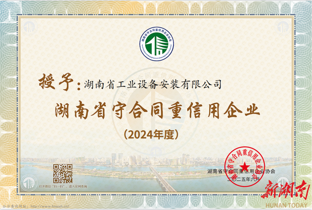 连续34年!湖南安装获评2024年度湖南省守合同重信用企业