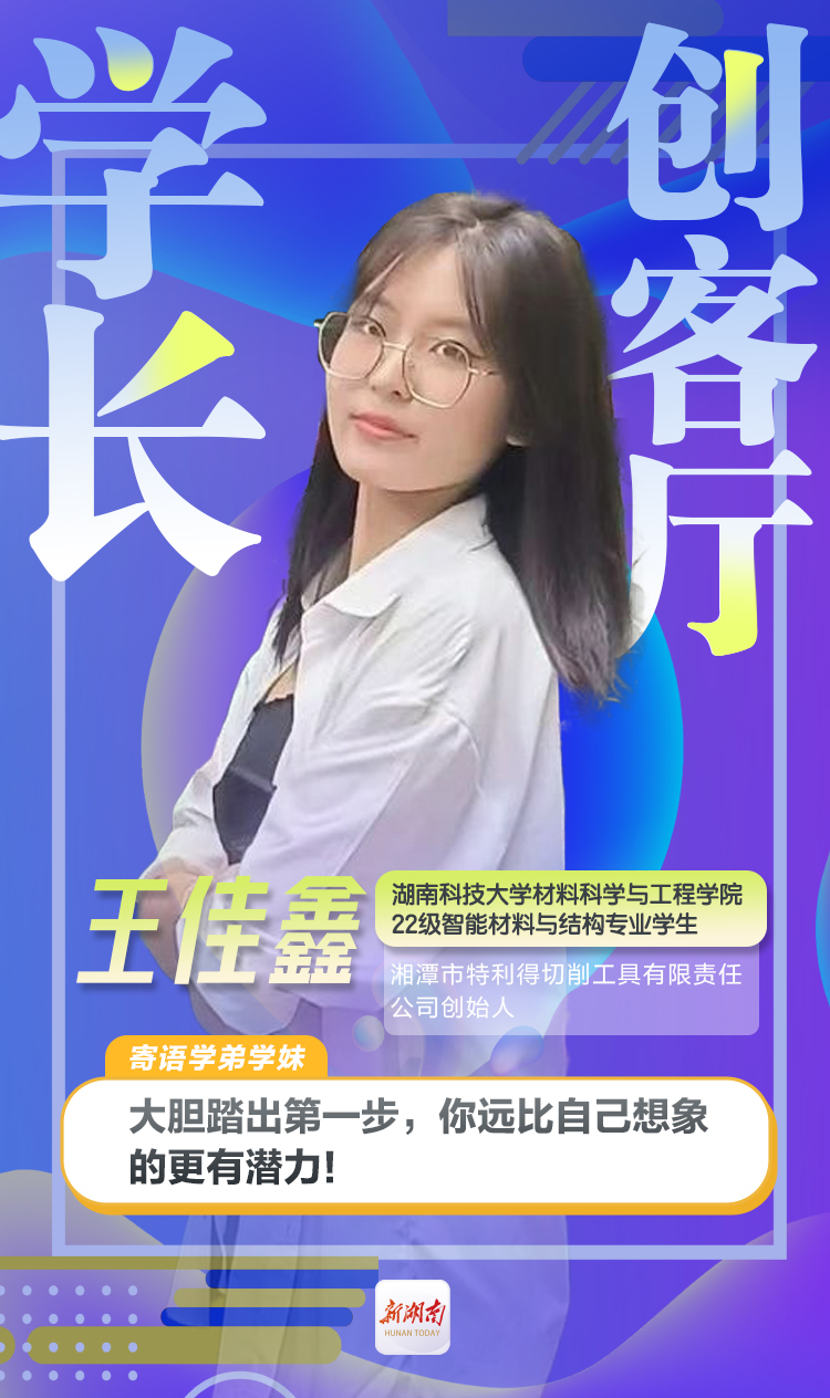 王佳鑫,湖南科技大学材料科学与工程学院22级智能材料与结构专业学生,于2024年3月份成立湘潭市特利得切削工具有限责任公司。她曾入选湘潭市创业典型(唯三个大学生项目之一),项目获湘潭市大学生创业优秀项目,并获得湘潭市人社局二等资助3万元,参与湖南省大学生投资资金现场尽调,曾获光明日报、中国青年网、学习强国、湖南卫视、团省委杂志《年轻人》等多家主流媒体报道,获得中国国际大学生创新大赛(2024)国家铜奖,与多家知名企业达成合作,团队手握12项专利,产品在军工、深海钻油等多领域得到应用,为企业创造巨大经济效益。