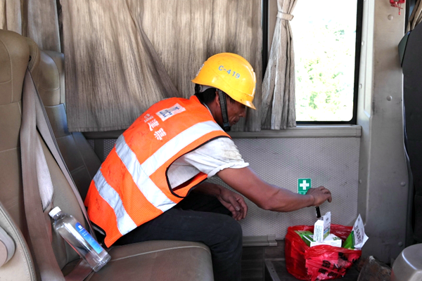 为应对高温天气,项目方精心制定了一系列防暑降温措施。由于高速公路线长、面广、点多,工人作业比较分散,项目方别出心裁地将大巴车改造成移动休息室来回在工地巡查,并配备了空调、饮用水、防暑药品等,让工人有感觉不适时能快速降温,避免中暑。工人杨建明称赞道:“有了移动休息室,身体不舒服时,能在车上喝水、吹空调、拿药,非常方便。”