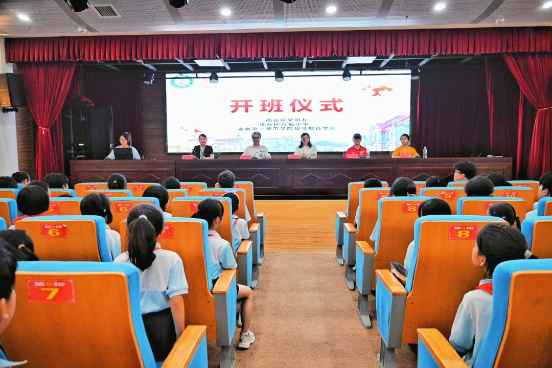 湖南日报7月8日讯(通讯员 肖妤昕 杨翼丞 全媒体见习记者 沈可心)以“教育助学”为桥梁,以“文化传承”为纽带。7月8日,湖南第一师范学院“祝童乐学”2025年暑期“三下乡”活动开班仪式在南岳区万福小学举行。南岳区委宣传部副部长、文明办主任陈丽凤,万福小学校长陈志敏,志愿者团队指导老师杨翼丞,22名大学生志愿者及106名当地小学生参与仪式,共同开启“三下乡”之旅。