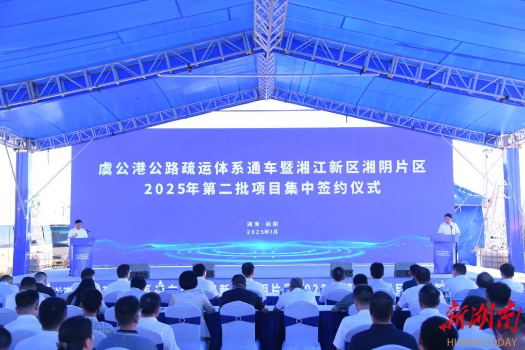 湖南日报·新湖南客户端7月10日讯(通讯员 周凤娇 胥扬 记者 周磊)7月10日,湘阴芙蓉北路北延线和进港大道上,10余辆满载集装箱的红色重卡组成首行车队,在崭新的沥青路面缓缓驶过,虞公港公路疏运体系正式通车。当日,湘江新区湘阴片区2025年第二批15个重点项目集中签约活动同步举行,总投资达106.5亿元。