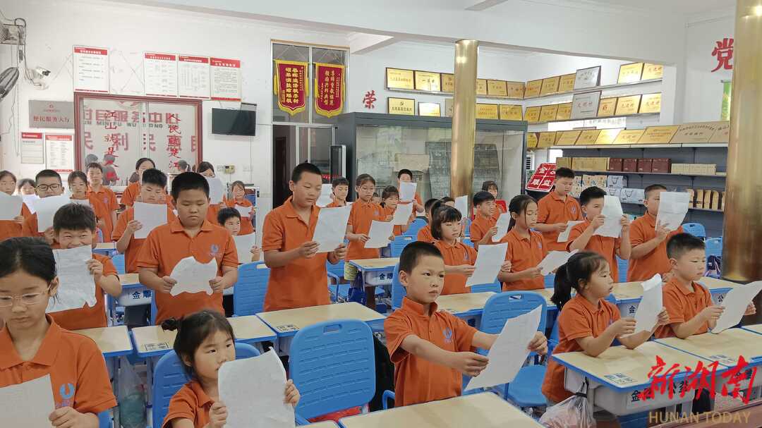 随后,志愿先锋队司徒铺村分队副队长李可欣将艺术教学与地域文化深度融合,依托司徒铺村湘安古道的历史底蕴,将“青年毛泽东游学故事”引入课程内容,通过音频赏析、韵律拆解、情感体悟等环节,引导孩子们感受《沁园春•雪》的豪迈气势与深刻内涵。孩子们分组朗诵、创意演绎,让经典诗词与古驿道的红色记忆交织共鸣。这种将乡土文化资源转化为艺术教育素材的方式,成为“播撒艺术种子”的鲜活注脚,让文化传承在艺术滋养中焕发生机。