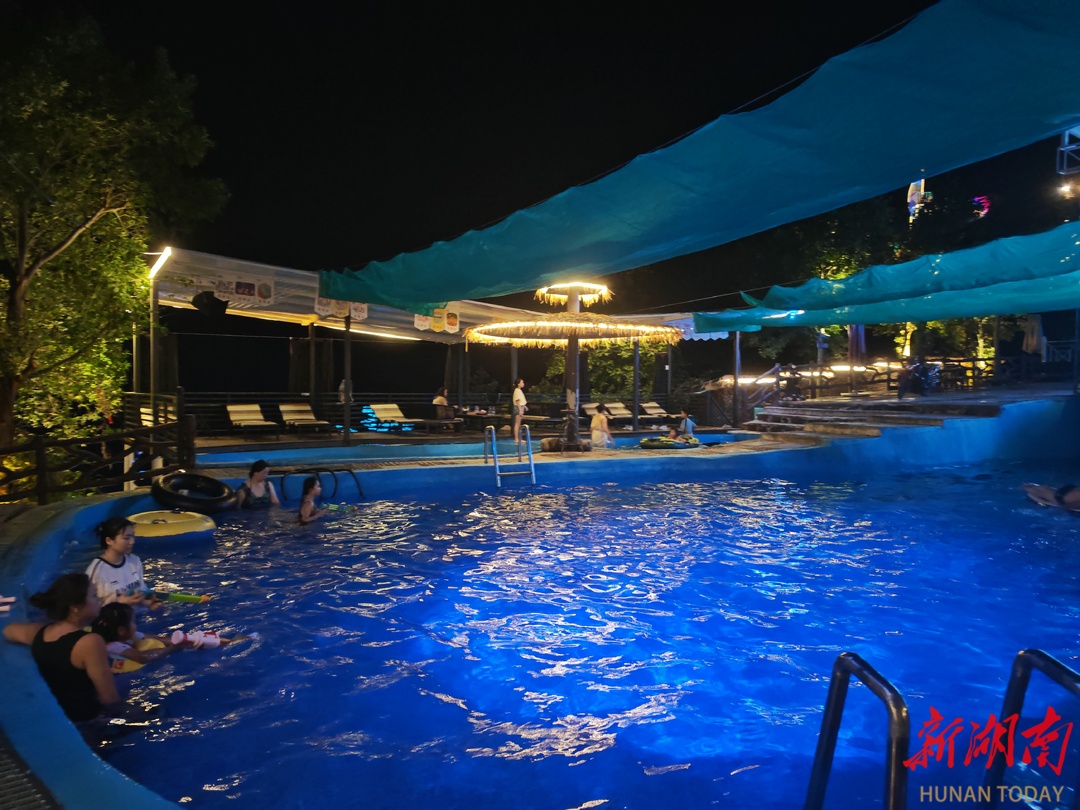 露天游泳池内,三五成群的孩童在浅水池或玩着充气划船奋力划水,或拿着水枪激情喷洒,或扎进深水池尽享清凉,水花与欢笑声此起彼伏;岸边上,特色美食、烧烤、饮料琳琅满目;音乐响起,游客们情不自禁地随着音乐尽情歌唱、摇摆。