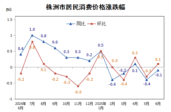 2025年6月份,株洲市居民消费价格同比下降0.1%,降幅比上月收窄0.3个百分点。其中,食品价格下降1.9%,非食品价格上涨0.2%;消费品价格下降0.6%,服务价格上涨0.5%。上半年,株洲市居民消费价格较去年下降0.1%。
