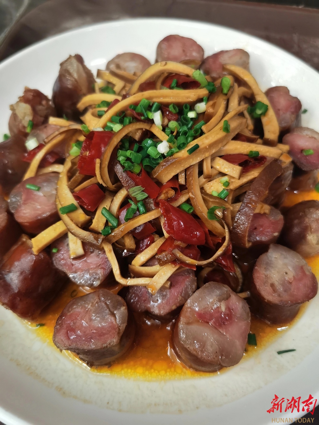 铁骨猪香肠是选用当地特有的散养铁骨猪猪肉为原材料,苗家人取其肥瘦相间的鲜肉切条,拌入浦市老坛盐、山花椒与米酒,静置一夜让滋味钻进肌理;再用清水洗净的土猪肠小心灌肠,悬于柴火灶梁,借松木烟火慢熏半月,直至肠衣染上琥珀色的油光。当地吃法有多种,其中红烧香干更妙,香肠的油香渗进香干的软滑,肥瘦相得益彰;若爱那口辣香,拌勺本地油辣椒,辣劲撞上腊味,味道十足。