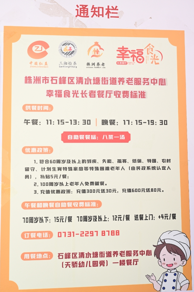 以清水塘街道养老服务中心“幸福食光”长者餐厅为例,70周岁以下的人群15元/餐,70周岁及以上的老人12元/餐,符合民政系统认定的特殊困难老年人在此基础上再补贴5元/餐,同时还有充值优惠和送餐上门服务。