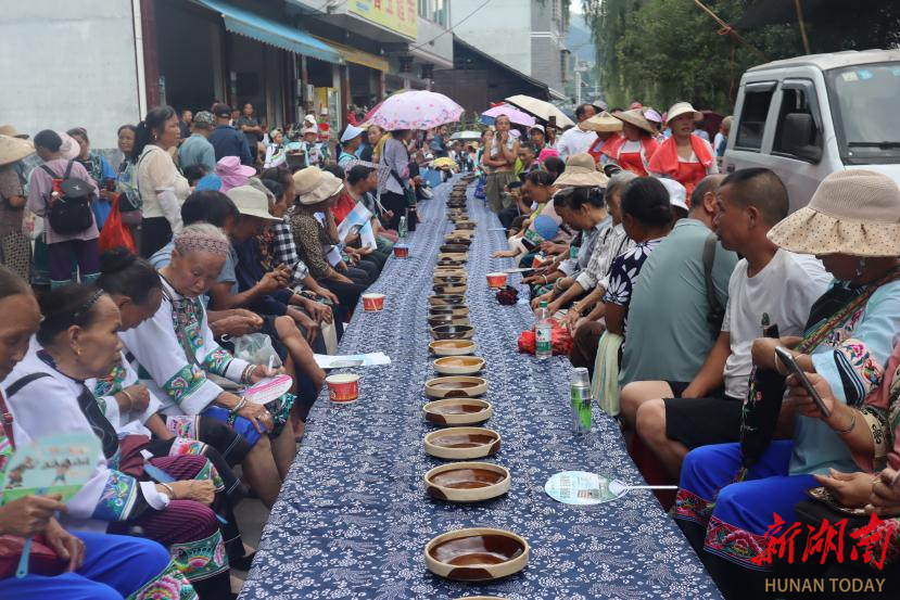 非遗展演结束后,“村厨村艺万家欢”特色长桌宴成为了文化交融的温馨纽带。沿街铺开的长桌上,苗鱼的鲜嫩、腊肉的醇香等特色美食香气四溢,每一道菜都承载着一段浓郁的乡土记忆与苗家人的待客热忱。实践队员们纷纷落座,与身边的村民亲切交流着民俗故事,在欢声笑语与美食的芳香中,彼此间的文化隔阂悄然消融。