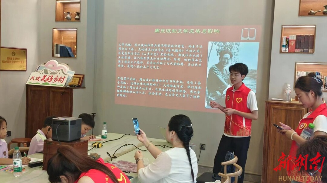 在清溪村唐宋轩工会驿站内,学生讲解员们围坐在小朋友中间,以“故事串联历史”的方式开启讲解。从周立波少年时期在清溪村的成长点滴,到他怀揣理想奔赴革命圣地延安的坚定步伐;从深入东北农村创作《暴风骤雨》的艰辛历程,到回到家乡益阳,扎根清溪村完成《山乡巨变》这部反映农业合作化运动的鸿篇巨制,每一个故事都深深吸引着小朋友们的目光。在讲解《山乡巨变》时,讲解员们结合周立波的手稿、照片等珍贵文物,详细解读作品中展现的乡村生产方式变革、人际关系变化以及农民精神世界的觉醒。