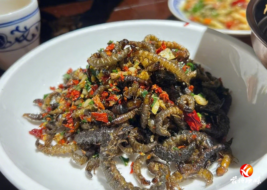 烹饪方法:先将桃花虫炒至六成熟,再加入辣椒、大蒜等佐料翻炒。成品色泽缤纷,青、黄、黑、红各色相间,油光透亮。热气蒸腾间,清香四溢,令人垂涎。初次品尝者或许会望而生畏,但只需鼓起勇气尝上一口,那独特的香脆口感与甘甜滋味便会瞬间征服味蕾,让人回味无穷。