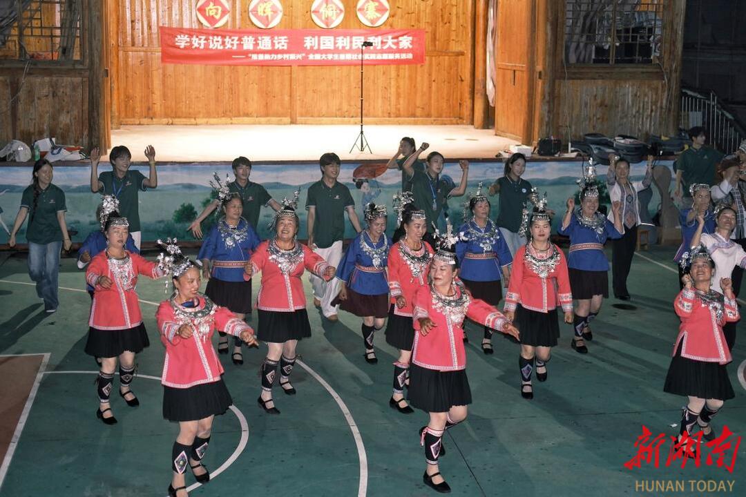 在靖州岩脚侗寨,“语润寨牙”团队创新“非遗+推普”模式,非遗传承人杨师傅现场展示侗族琵琶制作技艺,队员们则用普通话讲述“丝路女儿国”的传说与侗族风雨桥的前世今生。通道侗族自治县向晖村的联谊晚会上,侗族芦笙演奏《北京的金山上》与儿童合唱《明天会更好》相映成趣,最后的“哆耶舞”将村民与队员的手紧紧相连。团队还系统记录下侗族银器、苗族刺绣等200余件珍贵非遗影像素材。“推普不是要取代方言,而是搭建沟通桥梁。”靖州分队学生领队黄诗婕深有感触。