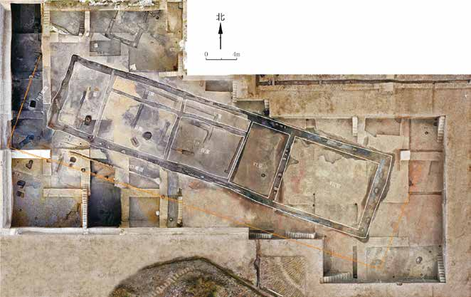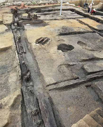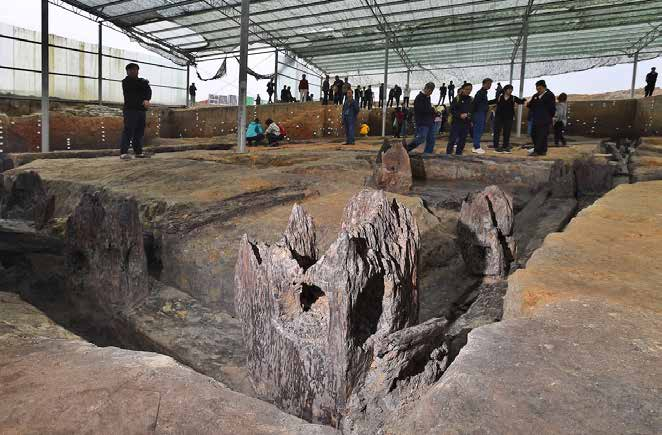 湖南澧县鸡叫城遗址发掘出的一处木结构建筑基础。2020年和2021年,考古工作者分3次对鸡叫城遗址西南城墙内侧进行发掘,揭露出一批木构建筑遗迹,规模体量之大、保存之完整,刷新了我国木构建筑史经过初步发掘可知,鸡叫城由一重呈圆角方形的城墙构成。城内面积约为15万平方米,略大于城头山,城外共有三圈环壕环绕,假如加上三层环壕,那么鸡叫城的面积便达到100万平方米左右,规模远超城头山。鸡叫城所在这片区域,在彭头山至大溪文化时期只有零星的人类活动,到油子岭文化时期才形成小型聚落。此时的鸡叫城聚落尚无城墙,只是和城头山筑城前一样在聚落外围挖掘了一圈环壕以排水。而到屈家岭文化时期,城墙在聚落外拔地而起,这圈堆土城墙宽10—60米,现存高度约4米,看上去已经不亚于“前辈”城头山了。城墙的四面留有城门,又有水道出北门与城外的第一圈环壕相连。第一圈环壕宽20—70米,深度超过1米,一条水道从环壕西北穿过,并直通不远处的涔水河,一条由城内到环壕再到涔水的水上通路便由此形成,货物可以很方便地通过竹筏等水上交通工具进出城池。如此看来,时代更晚的鸡叫城在筑城技术和规划思想上比城头山更为先进前卫。