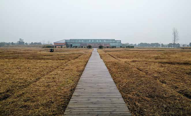 城头山国家考古遗址公园。考古工作者在城头山遗址发现距今6500年前的古稻田,稻田外侧建有田埂和原始的灌溉系统,田内淤泥布满裂纹,与现代稻田几乎一致,路尽头就是稻田祭坛遗迹展示馆最初,在汤家岗文化时期,初建的城头山只是一个面积仅4万平方米的普通聚落。在澧阳平原众多的聚落中,这一规模并不突出。此时,城墙尚未建起,城头山聚落仅仅在外围挖有环壕,可能用于防御野兽和在雨季排出积水。考古工作者在城头山聚落东北部发现一片开辟于此时的稻田,稻田外侧建有田埂和原始的灌溉系统,田内淤泥布满裂纹,与现代稻田几乎一致。这主要因为稻田在使用过程中常常需要灌水、排水,淤泥经过反复干湿交替产生裂纹,其中遍布稻叶、炭化稻粒等种植遗迹,可见此时澧阳平原上的稻作农业已经获得长足的发展,种植方式从原始的刀耕火种演变为精耕细作。在城头山聚落以西,澹水河潺潺流过,带来丰富的灌溉用水,聚落周边土壤肥沃,富含有机质。可能汤家岗文化先民就是因为这里优质的水土条件极适合栽种水稻,才将村落建在了城头山。