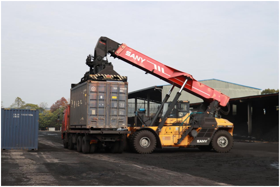 在绿之嘉实业的铁路专用线堆场,石油焦专列正在有条不紊地卸货。一台45吨集装箱正面起重机将铁路集装箱稳稳地装在新能源重卡电车上,两小时内,这些货物就能进入湘黔桂三省接边区域的化工厂。