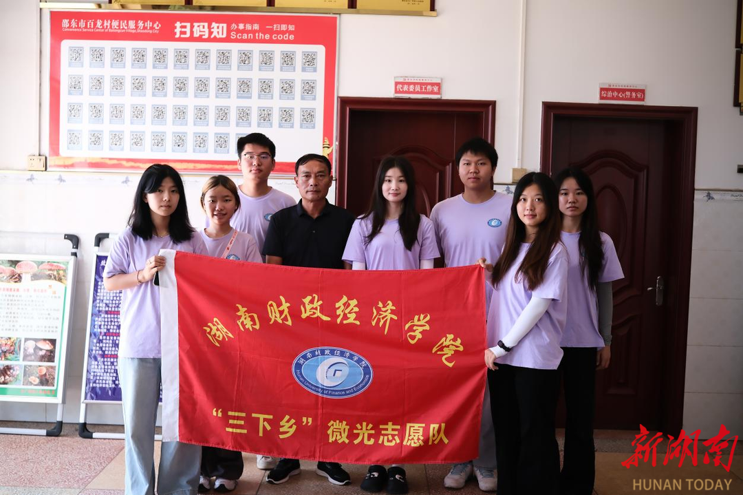 7月16日的清晨,湖南财政经济学院微光志愿队的队员们走进了邵东市火厂坪镇百龙村。村口的百年老樟树下,几个穿红马甲的年轻人正蹲在石碾旁,给围坐的老人演示手机扫码查办事指南。“婶子您看,点这个‘社保缴费’,一步就到位,不用跑镇里啦!”清脆的声音混着蝉鸣,成了队员们对这个村子的第一印象。