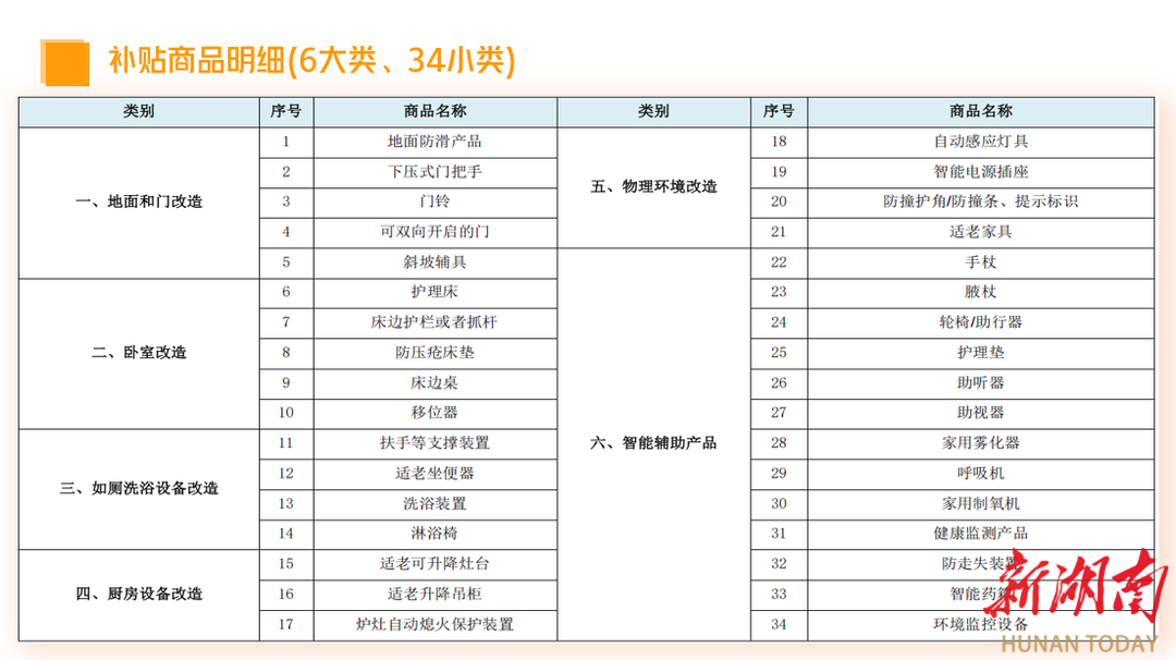 周楠介绍,开展适老化改造产品“焕新惠老”补贴活动,就是为了鼓励和支持老年人家庭进行适老化改造,以便适应老年人居家生活的特殊需求,提升其生活自理能力和生活质量。该活动涵盖了地面和门改造、卧室改造、如厕洗浴设备改造、厨房设备改造、物理环境改造、智能辅助产品等6大类共34项适老化产品,包括地面防滑产品、护理床、适老可升降灶台、健康监测产品、防走失装置等等,涉及老年人家庭生活的方方面面。