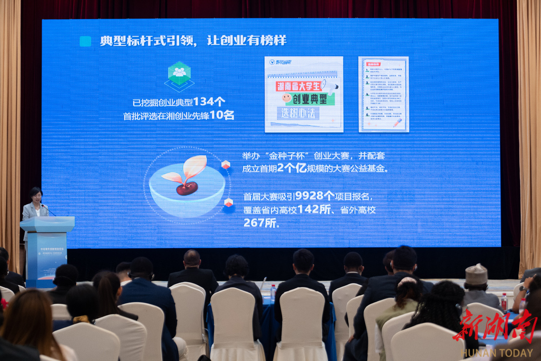 主旨演讲环节,湖南省青年联合会副主席叶妙介绍了我省支持青年创新创业的政策和举措,湖南大学非洲研究院常务副院长肖皓做了《非洲来华青年创新创业调查报告》主题报告。