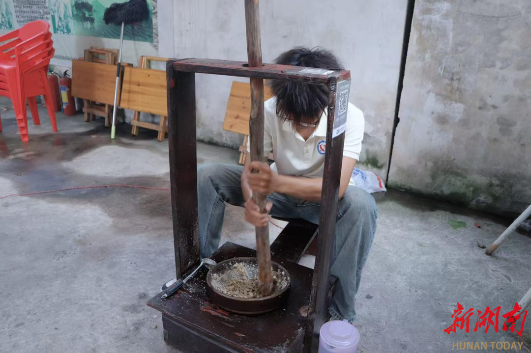 在村尾的民俗工坊里,擂茶的清香混着草木的气息漫出来。一对老夫妻正围着青石擂钵忙碌,爷爷握着粗长的木杵,一下下沉稳地撞击钵底,茶叶、花生、芝麻在“咚咚”声里渐渐碾成细碎的绿末;奶奶坐在旁边的竹凳上,手里的竹筛轻轻晃动,将碾好的茶末筛得匀匀的。