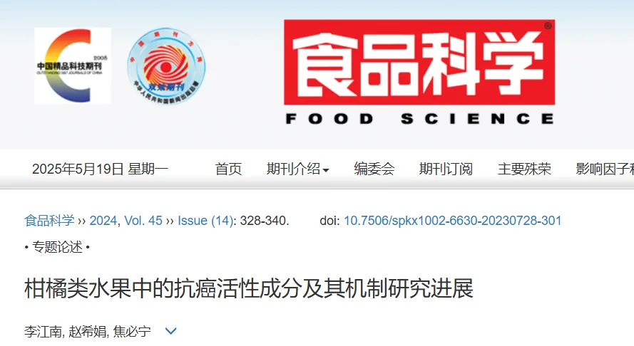 2024年,我国西南大学的科研团队发表在《食品科学》上的一项对柑橘类水果中的抗癌活性成分及其机制的研究指出,柑橘是一种有潜力的提取天然抗癌成分的植物来源,柑橘中的生物活性成分在预防不同类型的癌症疾病方面发挥着重要作用。④