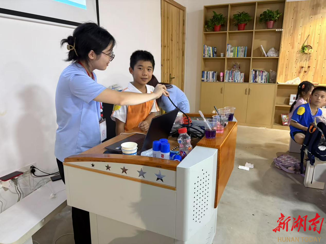 “哇——像魔术一样!”惊叹声划破了浏阳市永安镇老种子教室的宁静。那一刻,透明的白醋里滴入紫甘蓝汁,边缘晕开粉红,瞬间化作透亮的胭脂色。紧接着,当紫色汁液落入小苏打水,“唰”的一下,清澈的液体又变成了宝石蓝。孩子们的眼睛瞪得溜圆,小小的脸庞上写满了惊奇与兴奋。这不是童话,而是湖南财政经济学院人文与艺术学院“知行艺行”志愿服务队近日带来的“趣味实验探科学”科学实验课的现场。