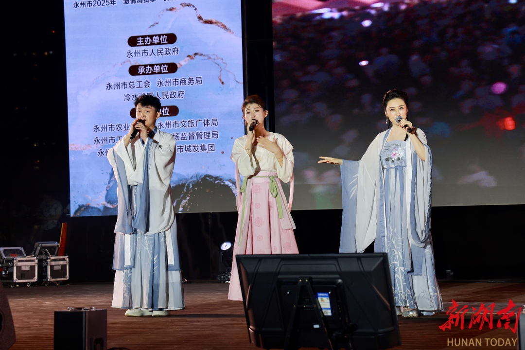 湖南日报·新湖南客户端7月21日讯(通讯员 温家利 张潇悦 周勇)7月19日晚,冷水滩区湘江西路婚纱草坪广场人潮如织。一场以“笑傲江湖”为主题的武侠专场音乐会在此激情奏响,为市民游客献上了一场融合文化、消费与娱乐的视听盛宴。湖南省歌舞剧院的青年歌手们化身“江湖侠客”,以经典武侠金曲为“剑”,在湘江之畔划出一道文化与消费交融的璀璨轨迹。