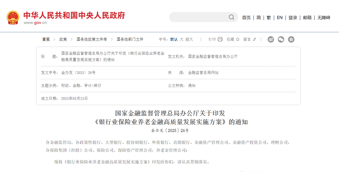 国家金融监督管理总局办公厅关于印发《银行业保险业养老金融高质量发展实施方案》的通知