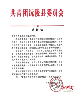 湖南日报·新湖南客户端7月21日讯(通讯员 谭帅 龚雅谊)湖南有色金属职业技术学院2025年暑期“三下乡”社会实践队离开怀化市沅陵县明溪口镇王家坪村不久,共青团沅陵县委、沅陵县明溪口镇人民政府分别发来感谢信和表扬信,给全体实践队成员极大的鼓舞。