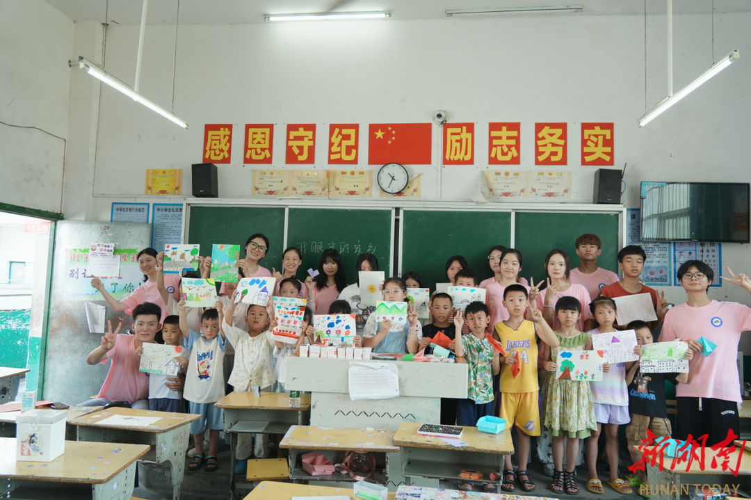 实践团队立足乡村儿童需求,开设“党建+美育”特色课堂。“这是吊脚楼,这是朗江河!” 绘画课上,师生党员悉心引导,孩子们用画笔描绘“我眼中的家乡”,古朴的吊脚楼、蜿蜒的朗江河跃然纸上,侗寨风情与苗族银饰在色彩交融中流淌,“爱我家乡”的种子悄然播撒进童心。音乐课上,《隐形的翅膀》温暖而励志的旋律向孩子们传递着坚韧自信的信念,当稚嫩的童声齐声唱出“我终于看到所有梦想都开花”时,希望的种子已在心田悄然播下。