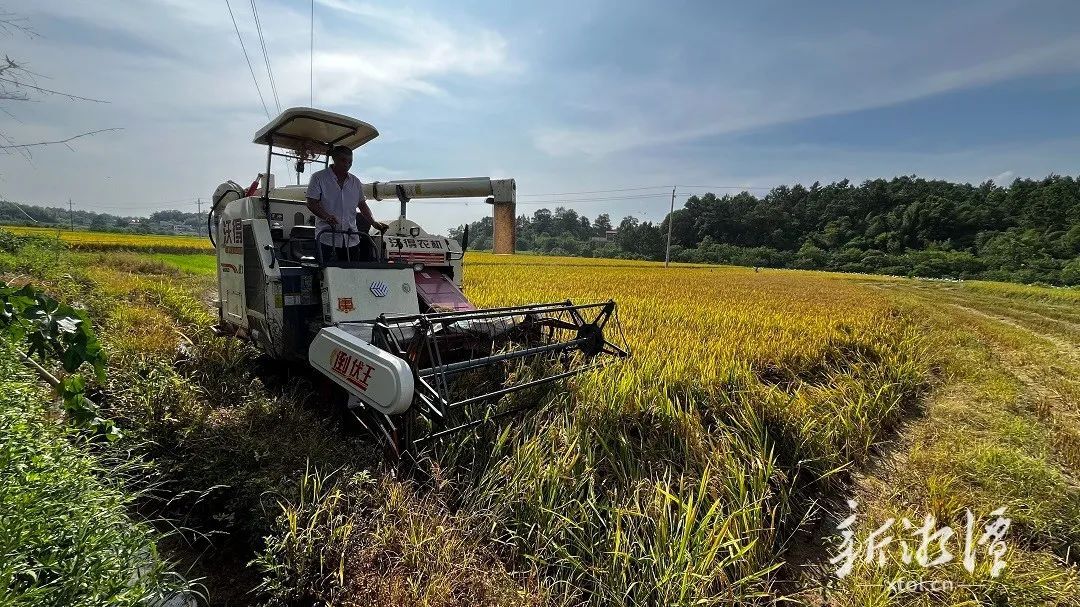 金黄的稻浪翻滚,收割机轰鸣作业。7月20日,湘潭县石潭镇中新村稻田里,一派热火朝天的“双抢”景象。种粮大户张放军抓起一把刚收割的稻谷,粒粒饱满。“你瞧,都是扎扎实实的谷子,送到粮站人家直接收走。”