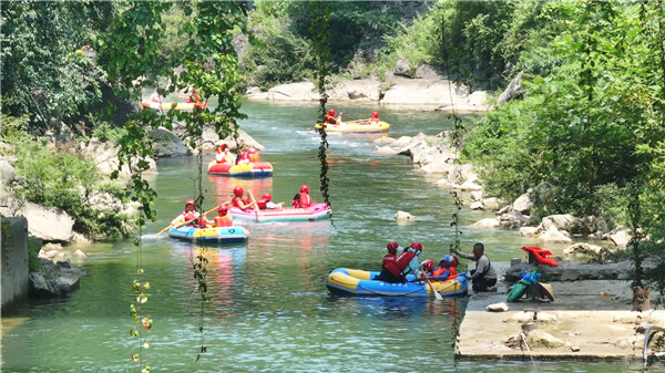 在漂流的上船点,游客们有序地穿好救生衣、戴上安全帽,在工作人员的细心引导下,登上橡皮艇开启奇妙之旅。当橡皮艇驶入湍急的水流,浪花高高溅起,打湿游客全身,大家在尖叫声中尽情释放内心的紧张与兴奋;到了平缓的水域,游客们则可以放慢节奏,悠然地欣赏两岸危崖夹峙、树木葱茏的秀丽景色,也可以用水瓢、水枪相互“攻击”,让清凉的河水洗去夏天的燥热。