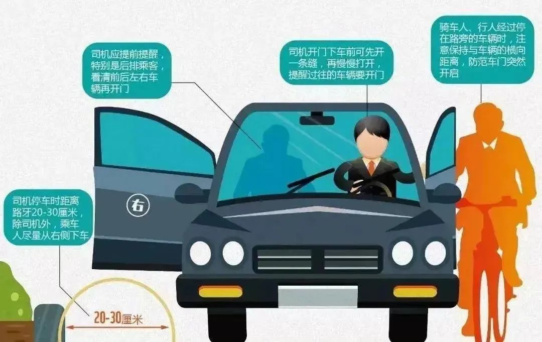 驾驶人应提前提醒乘车人,特别是后排乘客,要先看清车辆前后左右的来往行人、车辆情况,确认安全后方可开门下车。