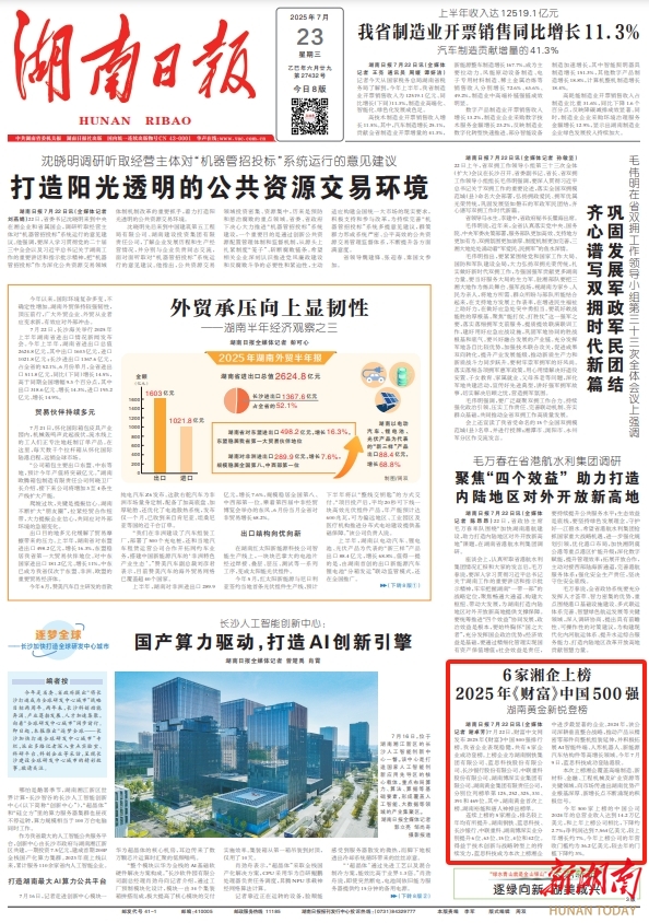 6家湘企上榜2025年《财富》中国500强 湖南黄金新锐登榜@湖南日报头版
