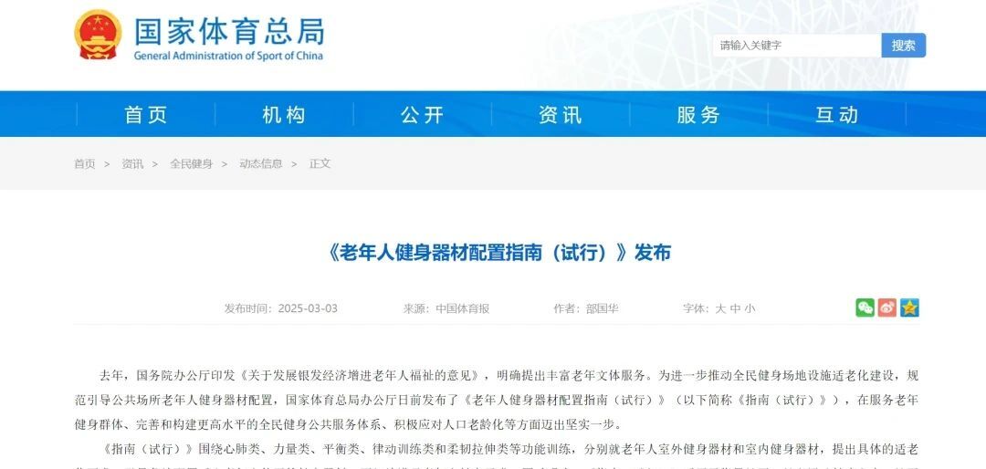 体育总局组织编制了《老年人健身器材配置指南(试行)》(以下简称《指南(试行)》)。
